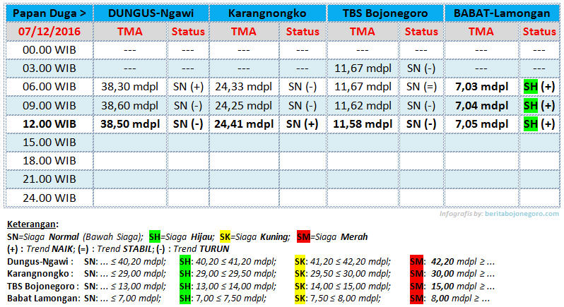 Hingga pukul 12.00 WIB pada Rabu (07/12/2016) siang ini, kondisi elevasi Tinggi Muka Air (TMA) Bengawan Solo pada pada duga Dungus Ngawi, Karangnongko Ngraho dan Taman Bengawan Solo (TBS) Bojonegoro Kota semuanya masih aman atau dalam status di bawah siaga. Sedangkan pada papan duga Babat Lamongan sejak semalam terdapat kenaikan dan hingga pukul 06.00 WIB pagi ini, masuk dalam status siaga hijau.