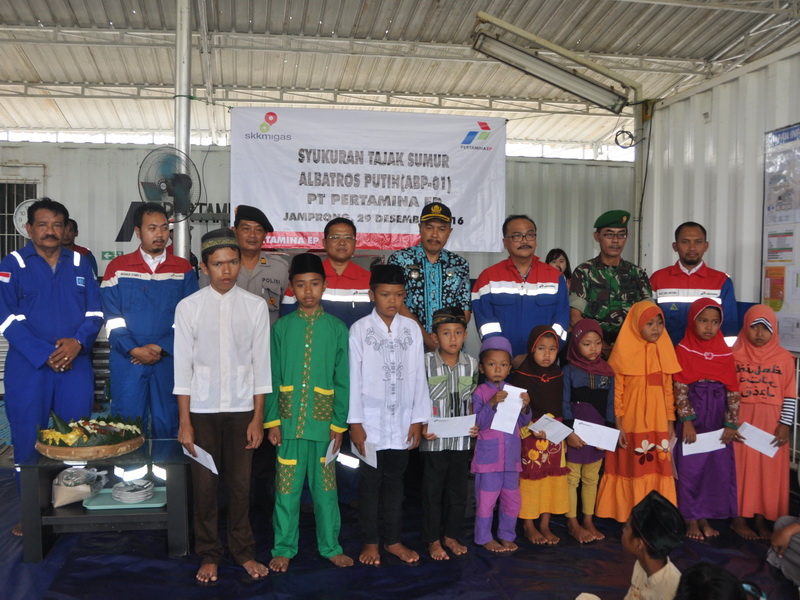 Dalam kesempatan ini juga dilakukan penyerahan santunan kepada 46 anak yatim-piatu yang ada di Desa Jamprong. Juga, pemotongan tumpeng sebagai salah satu bentuk syukuran tajak sumur ABP-01.
