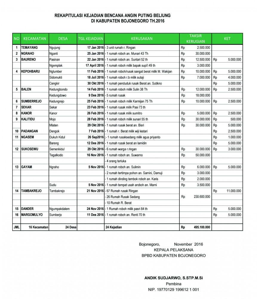 Bojonegoro Kota – Selama 2016, bencana alam puting beliung di Kabupaten terjadi sebanyak 24 kali. Total kerugian materi akibat kejadian ini sejumlah Rp 495.100.000. Data tersebut sebagaimana yang tercatat di Badan Penanggulangan Bencana Daerah (BPBD) Kabupaten Bojonegoro.